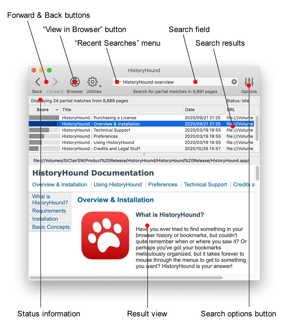 HistoryHound 是由 St. Clair Software 开发的一款 macOS 应用,专用于对浏览器历史、缓存、书签等内容进行全文索引与快速检索。简而言之,当你想找回某次曾访问但记不住在哪个浏览器或什么时间的网页时,HistoryHound 可以帮你快速定位。