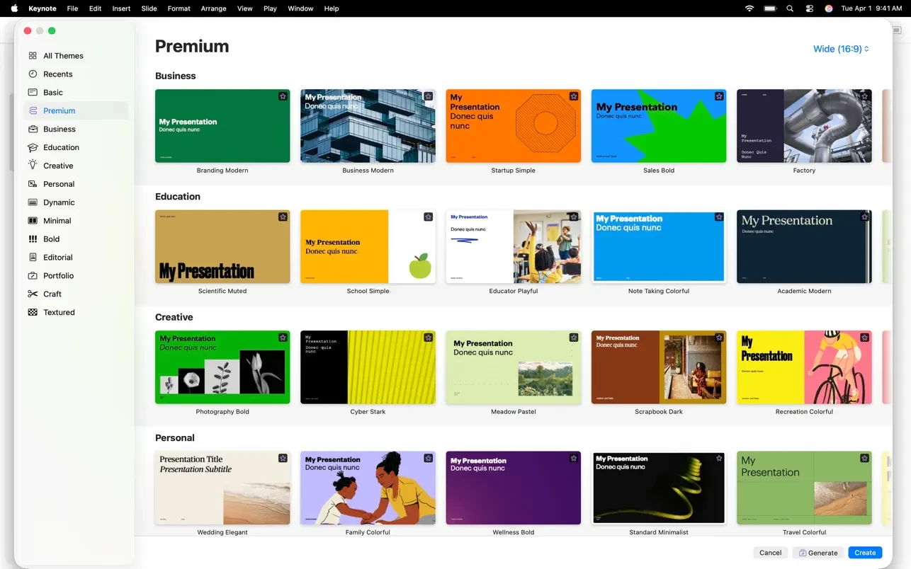 直接在 Keynote 中用描述生成图像,通过 AI 提升图片质量(Super Resolution)、智能裁切 (Auto Crop) 等。 - 专业模板与主题