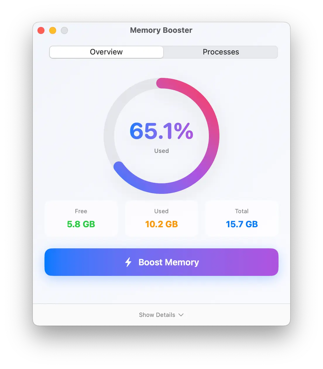Memory Booster 会在菜单栏显示当前的内存使用状态,清晰展示 已用内存、空闲内存、系统和各进程占用 的数据,帮助你直观了解 RAM 分配情况。