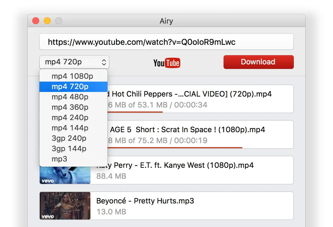 在Mac上下载YouTube视频简单整洁的Mac YouTube下载器,能够同时运行多个下载,选择您想要保存视频的分辨率和格式。Airy可以完全下载YouTube播放列表和频道。